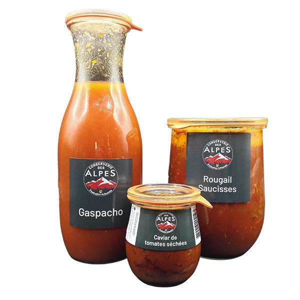 Ingrédients : tomates , poivrons, oignons, ail, citron, basilic, sel de Guérande, bouillon de légumes, vinaigre, piment, eau.