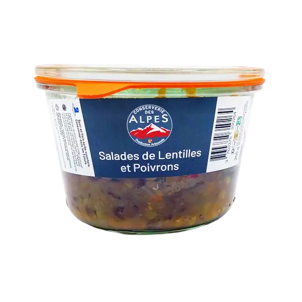 Lentilles vertes ( AURA ), poivrons, oignons, carottes, persil, VINAIGRE DE VIN BLANC( sulfites) , jus de citron, huile d’olive extra vierge, sel de Guérande